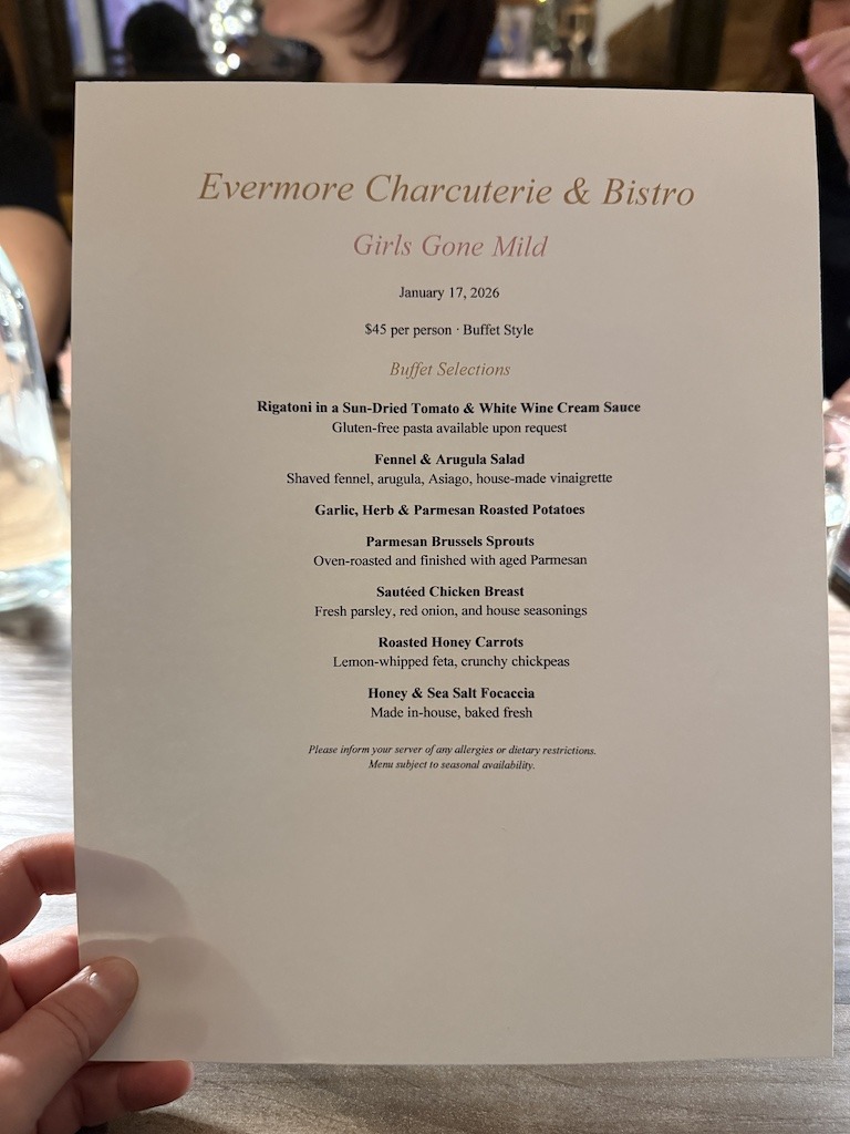 The second night we ventured out, and when I say “out,” I mean about 40 feet from the house straight into Evermore Charcuterie. Here’s the thing about visiting beach towns in winter: you can actually take over an entire restaurant. Which we did. The whole place was ours for the night, which meant zero judgment for our decibel levels.