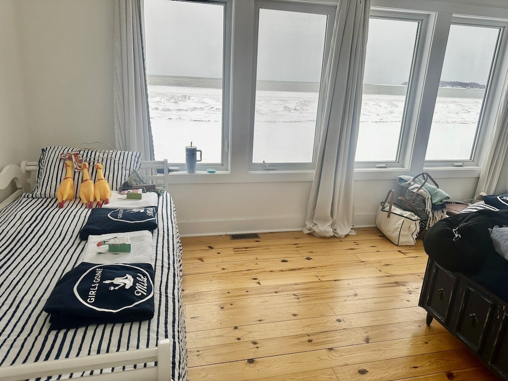 This year’s Girls Gone Mild headquarters was a beachfront Airbnb that checked every single box. White shiplap walls, a roaring fireplace, floor-to-ceiling windows framing Lake Erie, and enough room for our crew to spread out without stepping on each other. The aesthetic hit that sweet spot between coastal cottage and modern escape; think warm wood tones, a sectional sofa that could fit our entire bestie cuddle puddle, and a kitchen big enough to accommodate multiple cooks (and cocktail mixologists).