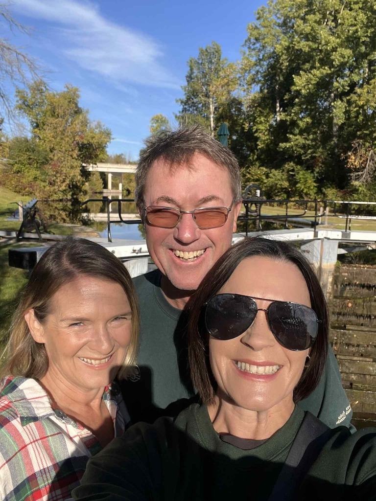 The Parks Canada lockmasters are one of the unexpected pleasures of this trip. They are stationed at each lock, ready to guide you through, and they are almost universally wonderful. I have run into Ian, my favourite lockmaster at Beveridges, on multiple trips now. The first time was during my divorce party, when he talked us through docking between two boats while a crowd of very enthusiastic bystanders shouted conflicting advice. He told us afterward that he had seen men who had been boating for years not park as well as we did. We absolutely believed him. When I ran into him again two years later I made him take another selfie, and well now? Now it’s a tradition.